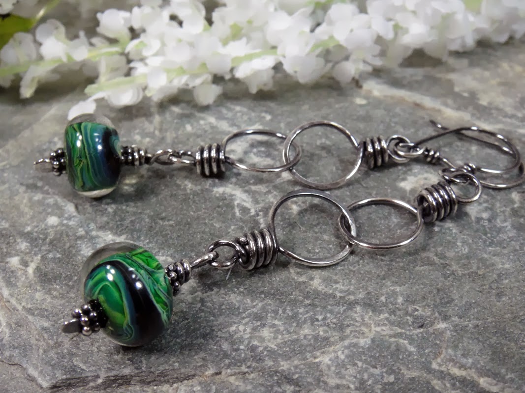 These colors are so intense and jewel toned! The link design is Cindy's, which combines two hoops into one design, which in my eyes screams "Earrings!" So, after seeing Kerry Bogert's design with these links in Cindy's book, I was convinced that these beautiful lampwork beads had to be on these double hoops! (Side note: Cindy and Kerry have been my two wire -idols for ages now - it is no wonder they are such good friends)!