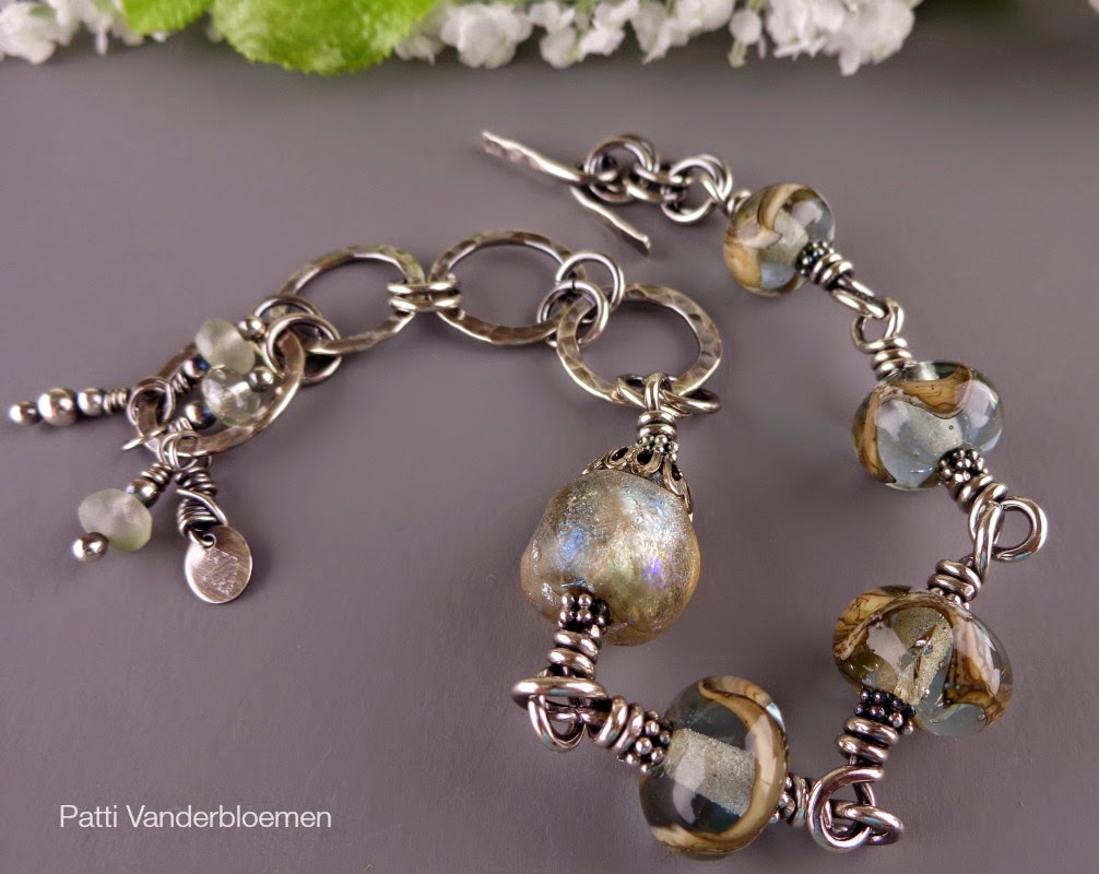 Lovely lampwork by Maryse of GlassBeadArt. And, I have been having so much fun with my torch (seeking warmth in the basement? Possibly)! I soldered and textured the links for the chain. Adjustable bracelets made easy!